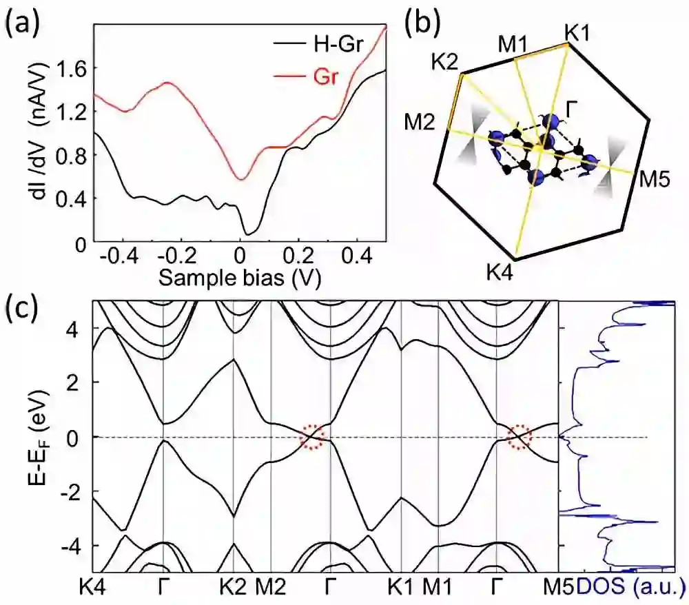 图3. 晶态三分之一氢化石墨烯dI/dV谱及DFT计算的能带结构与态密度图。