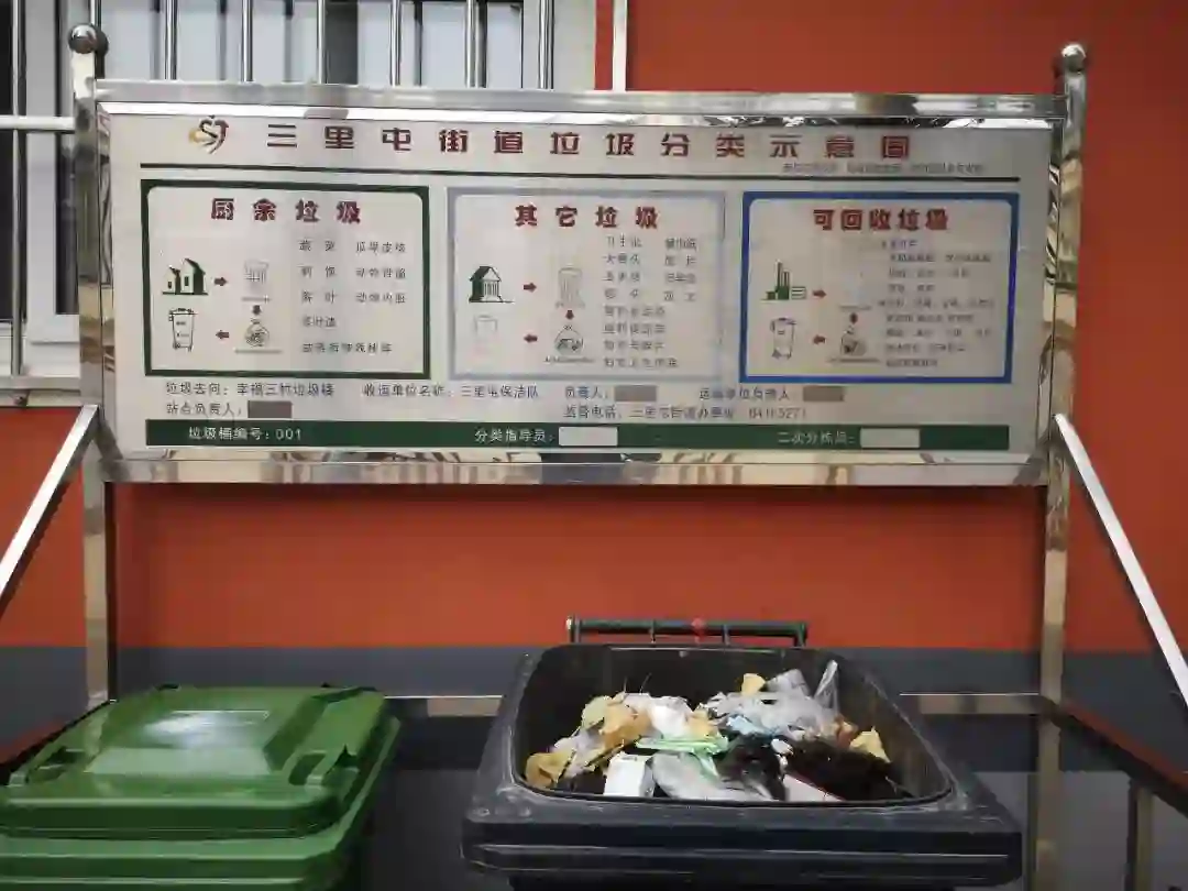 但王秀芳告诉我,大部分分拣员年纪大,不会使用智能手机,也很少有居民来找她扫码积分,“基本没有人会自己分。”我们按照经理的指示找到了位于幸福三村一处积分兑换点,也没有找到现场负责的工作人员。附近的老居民告诉我们,社区前两礼拜给各家发了垃圾桶,一个大的一个小的,但是有人拎着厨余垃圾出来,也没见人在那里兑换,只能顺手扔进了垃圾桶。