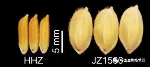 水稻超大粒材料JZ1560和小粒品种“黄华占”(HHZ)的谷粒表型