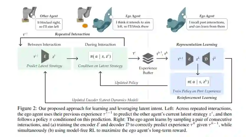 智能体与人类或机器人的无缝交互很困难,因为现实环境是动态变化的,并根据自智能体的行为更新策略,而自智能体必须预测这些变化以随机应变。受人类行为启发,我们认识到机器人不需要显式地为另一个智能体要进行的每一个低级动作建模;相反,我们可以通过高级表征来捕捉其他智能体的潜在策略。我们提出了一个基于强化学习的学习框架来学习一个智能体策略的潜在表示,其中自智能体识别其行为与另一个智能体的未来策略之间的关系。然后,自智能体利用这些潜在的动力来影响另一个智能体,有目的地引导他们走向共同适应的策略。在多个模拟领域和一个真实的空中曲棍球游戏中,本文的方法要优于其他方法,并学会了影响其他智能体。