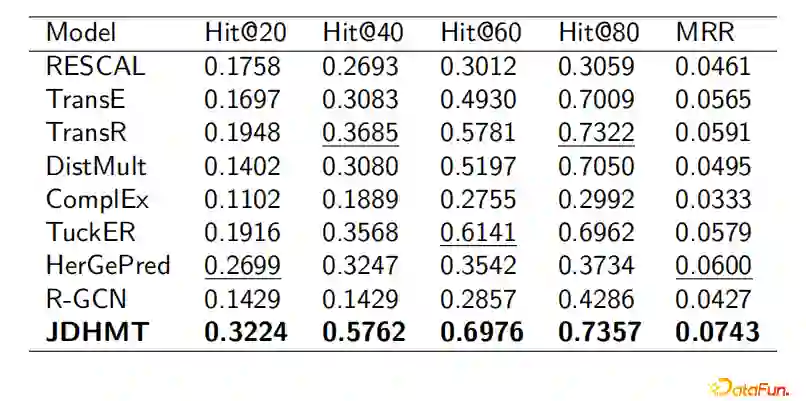 然后,就是利用模型,进行矩阵和张量的联合分解,包含A矩阵、V矩阵,这里A矩阵既能从医药数据库的文献条目获得,也能从构建的深层次图谱获得,通过融合计算,得到最终嵌入的A矩阵。最终,通过嵌入计算得到了基因和疾病之间的关联关系。