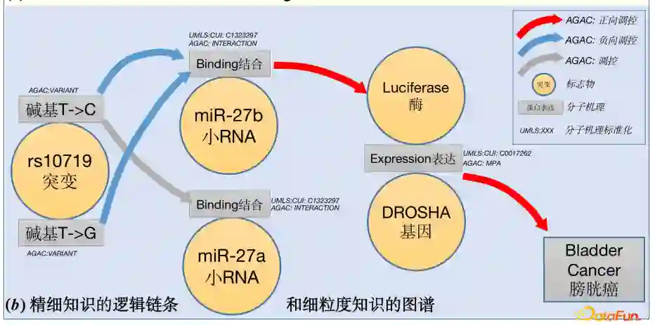 如上面已构建的图谱所示,一个经过标准化后的实体——RS10719突变,能抑制miR-27b小RNA的生物事件,能够促进Luciferase酶的表达,而且它能促进DROSHA基因的表达,从而能促进膀胱癌的发生。这种都是短线条的关系,如果把所有维度的事件、实体、关系都挖掘出来了,那么,我们就能更加容易地还原事件的真相。