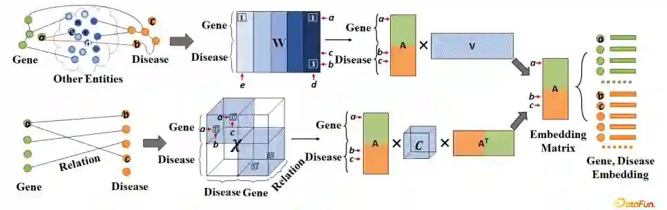 我们能把医药数据库的文献条目,放到一个二维矩阵里去(下图上半部分)。一般情况下,在这里,基因和疾病之间只有一种关系。