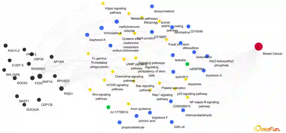 回到我们的场景——药物重定位。对于药物功能的发现,对于这么一个小规模、知识逻辑很清晰的图谱,从这里寻找一些重要的基因、RNA的标志物,再去寻找相关药物为靶向的标志物,再把药物引到该通路里来,观察治疗效果,这是很有启发的。