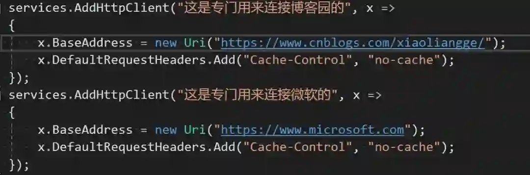 var client = _clientFactory.CreateClient("这是专门用来连接博客园的");//必须和services.AddHttpClient()中指定的名称对应