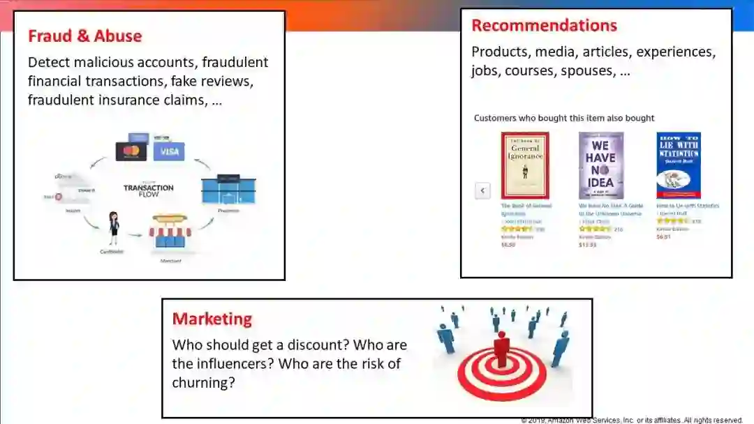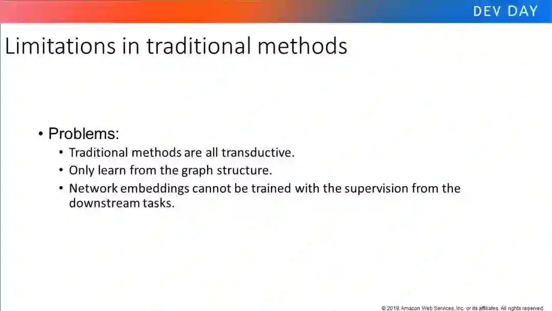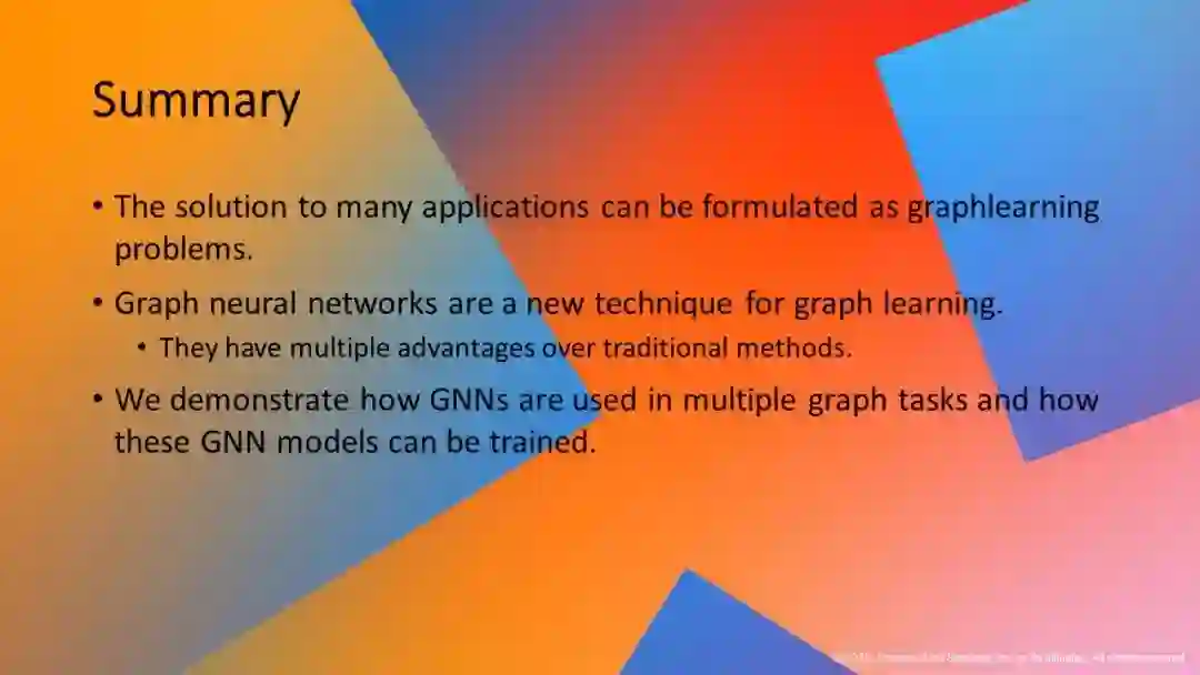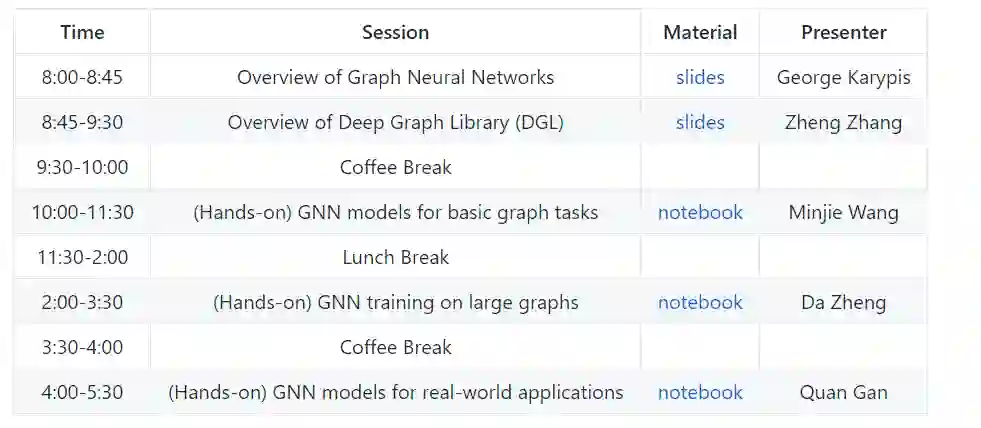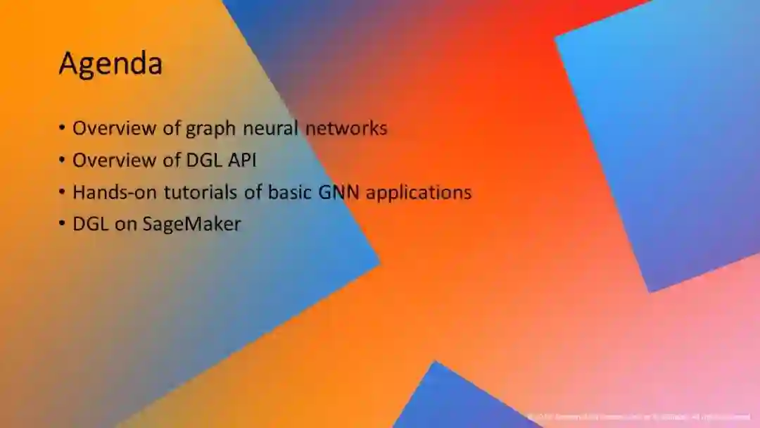 本教程的目标有两个。首先,它将概述GNN背后的理论,讨论GNN非常适合的问题类型,并介绍一些最广泛使用的GNN模型体系结构和设计用来解决的问题/应用程序。其次,它将引入深度图库(Deep Graph Library, DGL),这是一种新的软件框架,简化了高效的基于GNN的训练和推理程序的开发。为了使事情更具体,本教程将提供使用DGL的实践会话。这个实践部分将涵盖基本的图形应用程序(例如,节点分类和链接预测),以及更高级的主题,包括在大型图和分布式设置中训练GNN。此外,它还将提供使用GNNs和DGL进行实际应用(如推荐和欺诈检测)的实践教程。