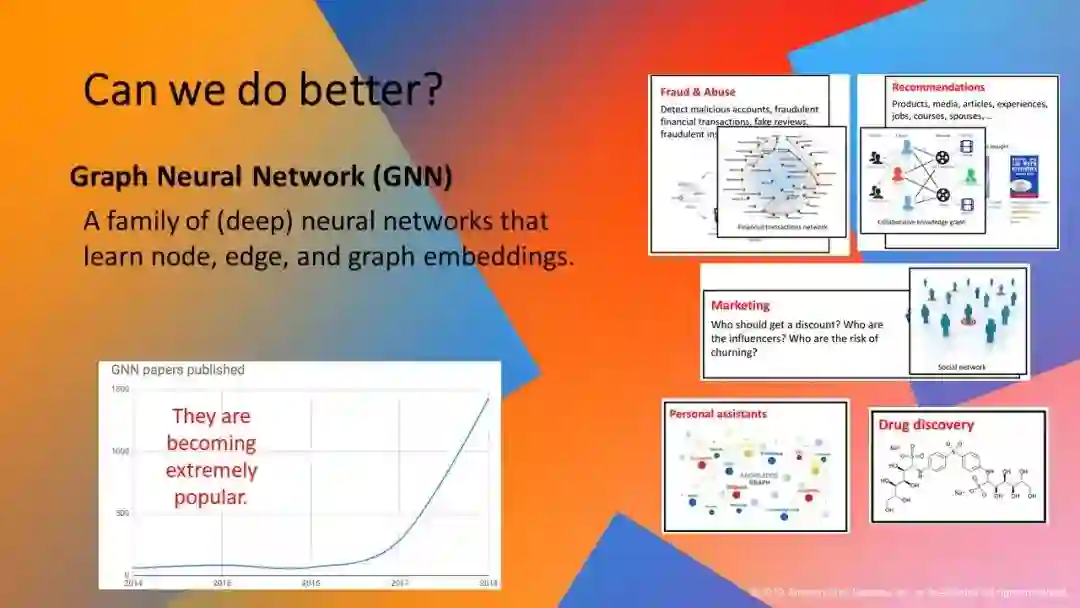 从图数据和关系数据中学习在许多应用中起着重要的作用,包括社交网络分析、市场营销、电子商务、信息检索、知识建模、医学和生物科学、工程等。在过去的几年里,图神经网络(GNNs)已经成为一种很有前途的新型监督学习框架,能够将深度表示学习的能力引入到图和关系数据中。越来越多的研究表明,GNNs在链路预测、欺诈检测、目标配体结合活性预测、知识图谱补全和产品推荐等方面的性能达到了最新水平。