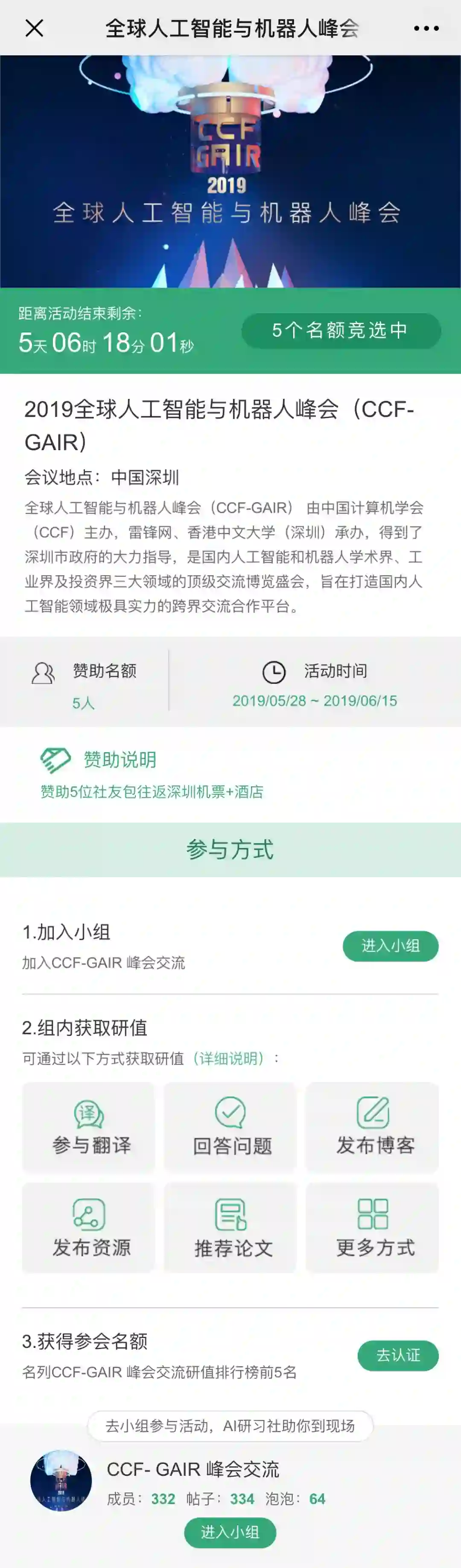 加入「CCF - GAIR 峰会交流」小组并且在 2019 年 6 月 15 日前,研值积累排行前五,即有可能获得赞助计划名额。您可以通过在小组内发布泡泡、笔记、帖子等来获得相对应的「研值」。