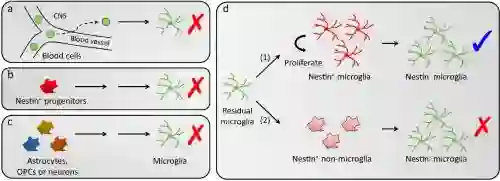 近日,中国科学院深圳先进技术研究院彭勃团队与香港大学医生饶艳霞、上海精神卫生中心教授袁逖飞合作,通过多种谱系追踪(fate mapping或lineage tracing)技术推翻了前人关于再殖小胶质细胞起源于Nestin阳性前体细胞分化的结论,并发现其再殖小胶质细胞完全起源于残存的小胶质细胞增殖。