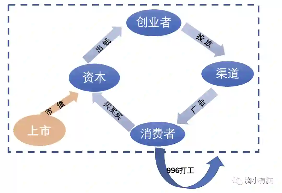 资本为了造风,用钱砸赛道→创业者拿去做产品、造概念→抖音快手小红书b站的博主和平台拿了广告费帮宣传→消费者看了宣传,买到了更新更潮更做自己的“精致生活”。
