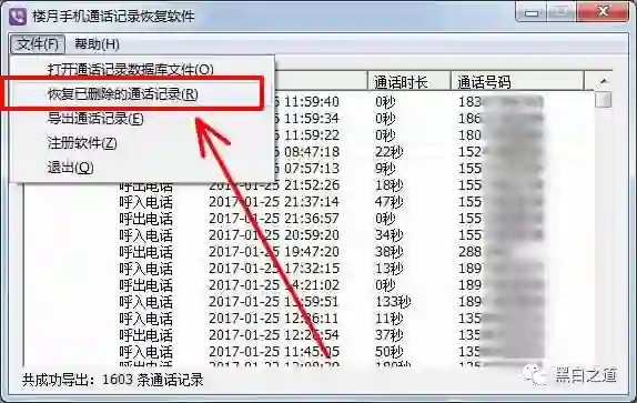 5,再点击“文件”,“恢复已删除的通话记录”菜单。