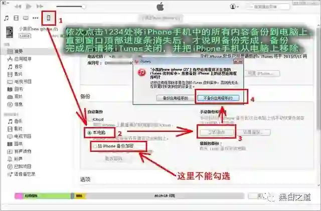 2,在电脑上安装并打开iTunes软件,使用该软件把苹果手机中的全部数据都备份到电脑上,备份方式请看下图说明。