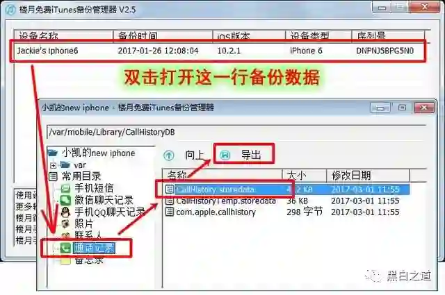 3,接着安装并打开“楼月免费iTunes备份管理器”,双击打开备份数据后,把通话记录项右边的CallHistory.storedata文件导出到电脑上。