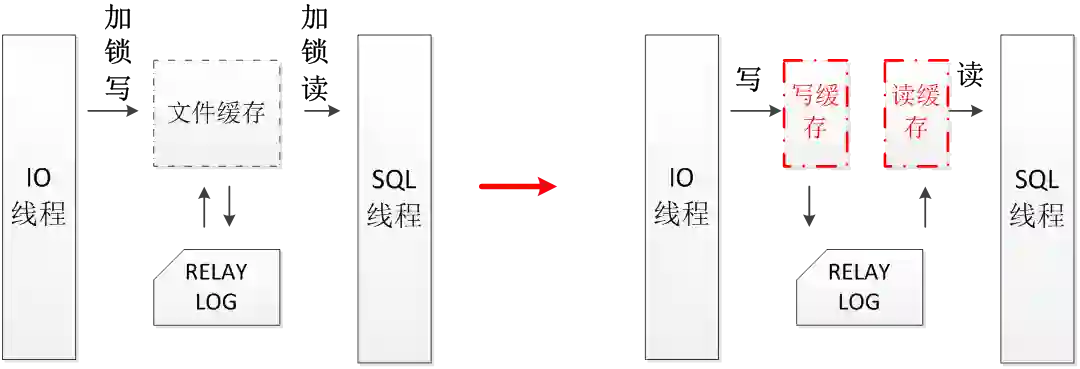 将IO线程和SQL线程对relay log的操作拆分开来,不再使用同一块文件缓存。虽然这样做会导致SQL线程增加一次读IO操作。但是消除了对锁的竞争,大大地提高了IO线程和SQL线程整体的性能。
