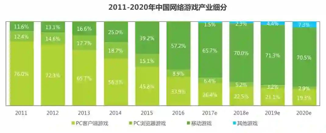 来看一张2016-2017年艾瑞发布的游戏品类市场份额。