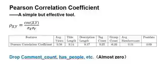初始阶段,我们对数据集进行了一些简单的数据分析,通过计算相关元数据与流行度之间的皮尔森系数,我们丢弃了部分无用的特征。从上图所示分析表中可以看出,一个用户的平均浏览量(即所有图片浏览量之和的均值)与label的关系最大,几乎起决定性的作用。