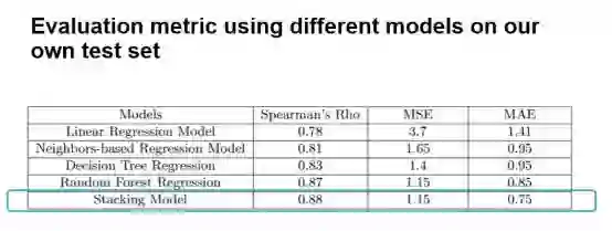 最后结果显示,融合模型的效果不错,交叉验证后spearman系数能达到0.88。