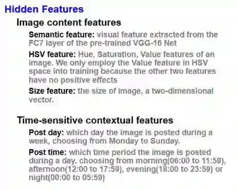 我们知道这次比赛的任务的目标是预测社交媒体上一个用户提交的不同条目的影响力。有很多因素影响到一个图像的流行度,不仅仅是图像本身特征,还包含用户社交信息,例如上传时的描述,甚至是上传时间等等。在这个项目中,作者提出了一种快速有效的框架。首先是对图像特征与社交特征进行选择,图像特征包括全局特征描述,例如Local Binary Pattern与Color Names,局部特征描述,例如Local Maximal Occurrence,以及深度特征。对于社交特征,用户特征,条目特征和时间特征被选择出来。除此之外,多特征的融合分别使用在线性回归,基于时间与特征聚类的矩阵分解,以及SVM模型上。之后对预测结果进行了比较分析。最终选择了效果最好的方法来对测试图像的流行度进行预测。