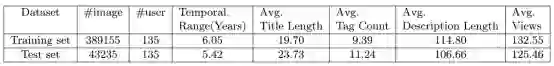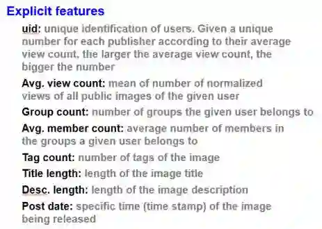 上述特征是能够直接从数据集中获得的特征,比如用户平均浏览量,分组的个数,每张图片对应的标签数量、标题长度、描述长度等,甚至是图片的发布时间。