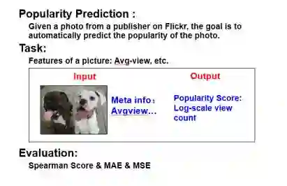 这个任务的目的是预测一个用户在社交媒体上发布不同状态的影响力,比如,给定这个用户的一张照片,自动预测照片的流行度(如Flickr上图片的浏览量(View Count)等)。由于组织方公布了一份基于Flickr平台的数据集,所以这次任务的主要目的,就是利用Flickr上用户的部分照片的浏览量,预测其余照片的浏览量。具体来说就是输入用户发布的Flickr图片特征,输出图片浏览量的对数值。评价指标为spearman’Rho, MAE和MSE。
