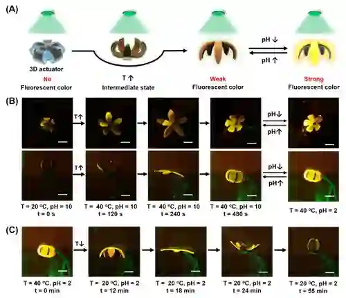 自然界中的一些动植物(如变色龙、章鱼以及金银花等),不仅可以自驱动(变形或运动),还能在各种外界刺激下,导致身体或皮肤对光的吸收、反射能力或者自身发光性质的变化,从而改变自身的体色,进而达到伪装自己、交流信息等特定目的。然而目前研究的水凝胶驱动材料及其仿生设备,很难兼有复杂驱动和变色两种智能功能。这种智能功能的单一性,严重限制了智能水凝胶材料的进一步应用。针对这一研究中的“瓶颈”,他们基于在智能驱动和智能变色方面长期的研究基础,开发了一种具有3D复杂驱动-智能变色双功能协同的新型智能仿生水凝胶(Adv. Funct. Mater. 2018, 28, 1704568)。通过制备两种水凝胶模块:(1)pH响应性的荧光变色水凝胶,即苝酰亚胺功能化的超支化聚乙烯亚胺(PBI-HPEI)水凝胶;(2)温敏性的智能变形水凝胶,即氧化石墨烯-聚N-异丙基丙烯酰胺(GO-PNIPAM)复合水凝胶。然后通过宏观超分子组装,将收缩状态的智能变形水凝胶和pH响应荧光变色水凝胶粘合得到双层非对称结构,剪成特定的图案并放入冷水中,可直接形成各种预设3D形状。此水凝胶的复杂驱动如同一个开关,可以控制荧光的产生/消失:在初始状态,变色水凝胶被包在了内层,而外层的智能变形水凝胶可遮挡绝大部分的激发光,此时变色水凝胶不能发出荧光;只有当外界温度升高,外层水凝胶收缩并带动整个双层水凝胶发生复杂形变,内层的变色水凝胶才能暴露在激发光源之下并发出黄色荧光;随后,通过改变溶液的pH可进一步调节变色水凝胶的荧光强度(图2)。该研究成功实现了智能驱动和变色功能的协同。