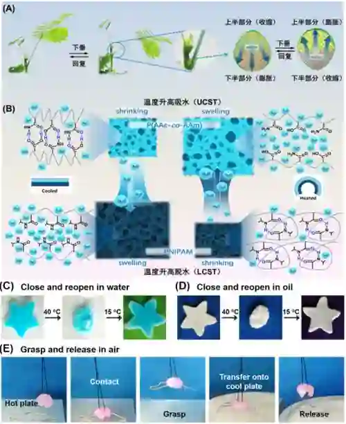 图1 (A)含羞草在空气中响应及其响应机理,(B)具有水分子内循环系统的双层水凝胶,双层水凝胶在(C)水、(D)油、(E)空气中的响应功能
