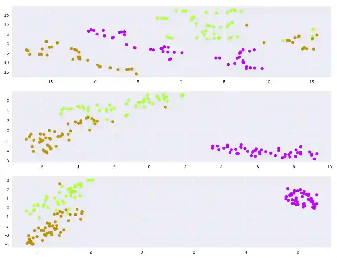 这意味着聚类之间的距离和聚类大小可能被误导,并且也会受到所选择的困惑度的影响(在上面我推荐的文章中,你可以看到这些现象的可视化)。