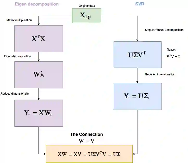 所以 Eigen 分解和 SVD 都是分解矩阵的方式,让我们看看它们可以在 PCA 中提供怎样的帮助,以及它们有怎样的联系。