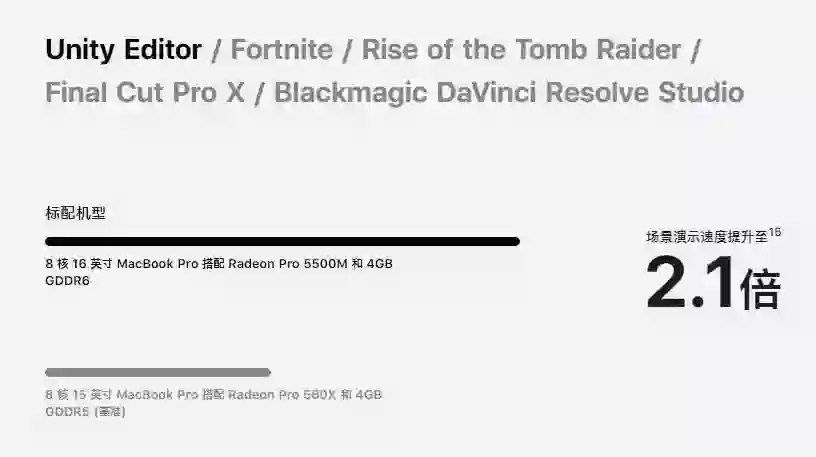 图形处理性能对专业人士至关重要,无论是创作下一个游戏作品、渲染复杂的三维场景,还是为电影大片进行调色。16 英寸 MacBook Pro 配备新的 AMD Radeon Pro 5000M 系列图形处理器,这是首款为专业用户打造的 7 纳米制程移动独立显卡。在 Mac 笔记本电脑上首次可选配 8GB 的 GDDR6 显存,专业用户从此能够比以往更快速地处理需要大量图形处理器资源的任务。用户选择标配图形处理器时,将会实现比上一代标配提升至 2.1 倍的图形处理性能。选择高配图形处理器时,将会实现比上一代高配提升最高可达 80% 的图形处理性能。