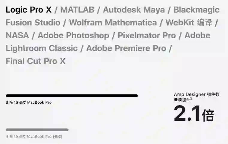· 音乐制作人在 Logic Pro X 中播放大型多音轨项目,其中 Amp Designer 插件数量最多可增加至 2.1 倍。
