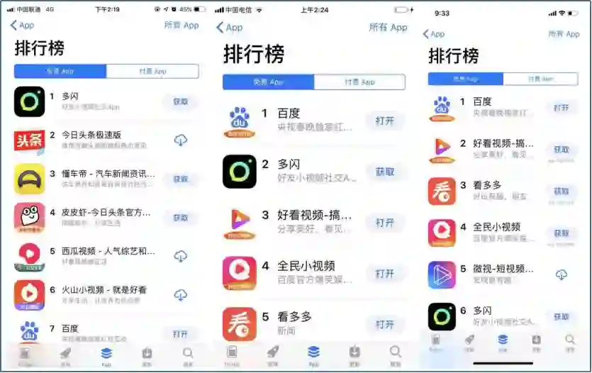 无图无证据,有图有真相。上面左图是除夕节前截图,多闪、头条极速版等头条系APP一路狂飙突进;中间是除夕后,百度春晚豪砸9亿一夜翻身,百度APP、好看视频等多个百度系APP冲入前五;而在最近排行榜上,百度系依旧霸榜,多闪持续下滑而微视悄悄赶上。