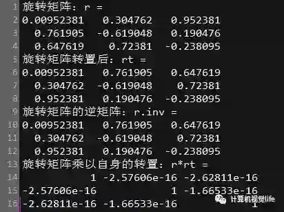 输出四元数对应的旋转矩阵、旋转矩阵的转置,旋转矩阵的逆矩阵,旋转矩阵乘以自身的转置,验证旋转矩阵的正交性。