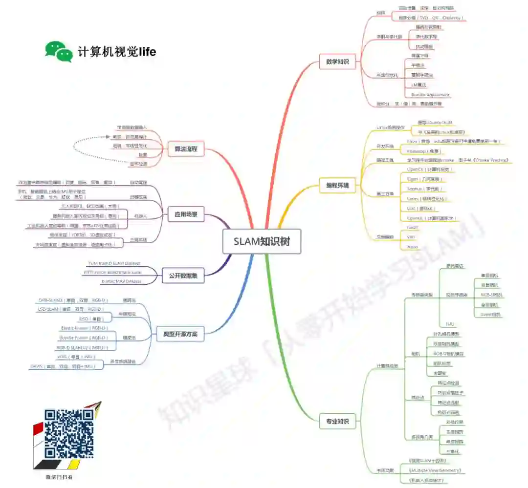 SLAM涉及的知识面很广,我简单总结了 “SLAM知识树” 如下所示:
