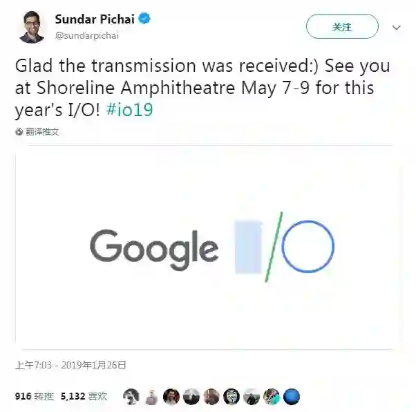 北京时间1月26日消息,谷歌公司 CEO 桑达尔·皮查伊(Sundar Pichai)已在 Twitter 上证实,谷歌将于5月7日至9日在其总部加州山景城的海岸线圆形剧场(Shoreline Amphitheatre)举办2019 I/O开发者大会。