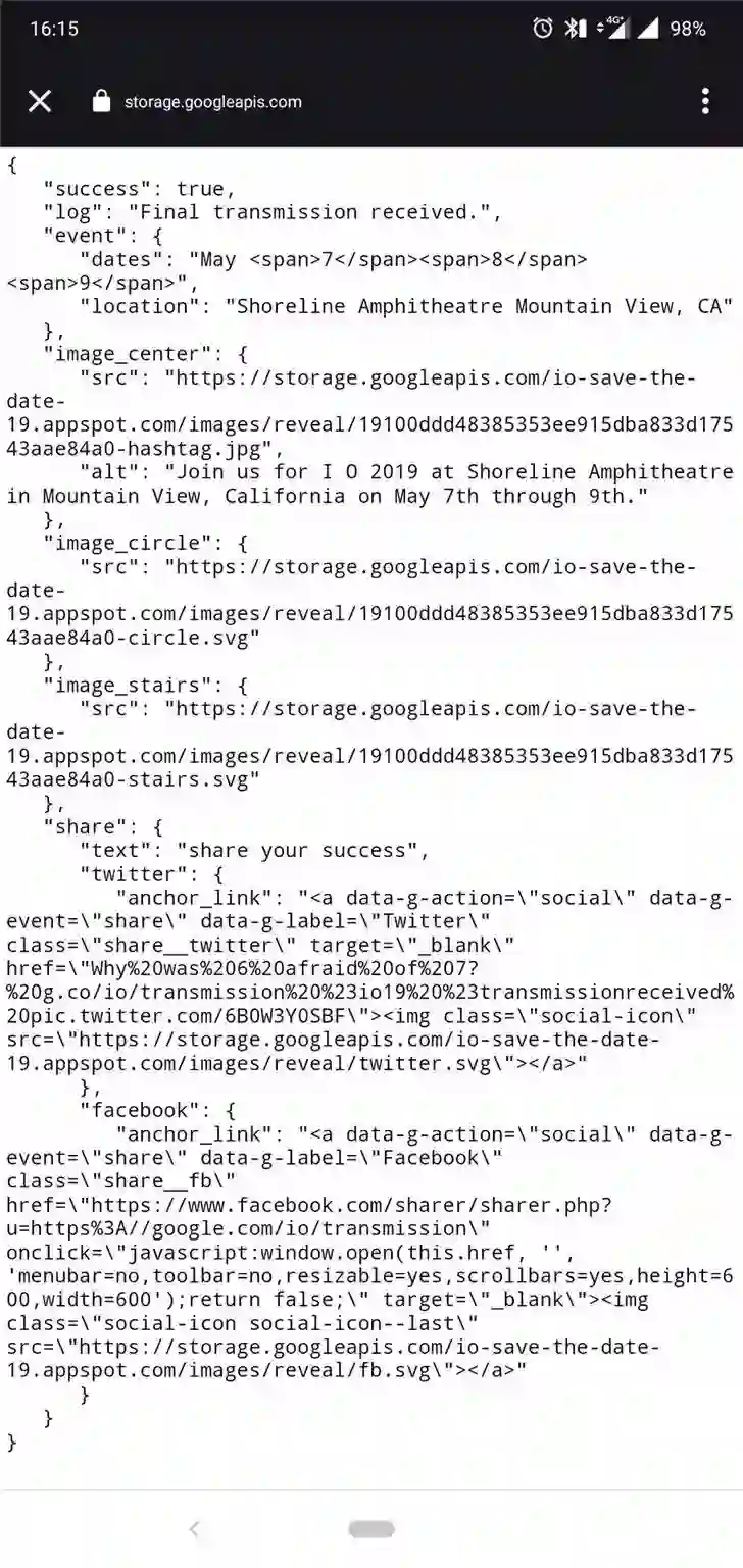 谷歌每年都会通过「谜题」的形式将开发者大会举办时间隐藏在其中。今年谷歌在 Twitter 上发布推文,把开发者大会的举办时间隐藏在了一段 JSON 代码中。最终,名为蒂尔·科特曼(Till Kottmann)的 Twitter 用户破解了谜题。