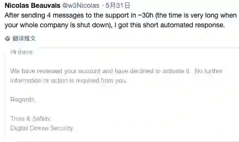 在随后漫长的 30 个小时内,Raisup 公司发出 4 封邮件,但最终只收到 DO 的自动回复,拒绝解封。(如果你们公司被莫名其妙地被封,在焦急等待的过程中,30 个小时的确非常漫长。)