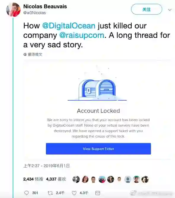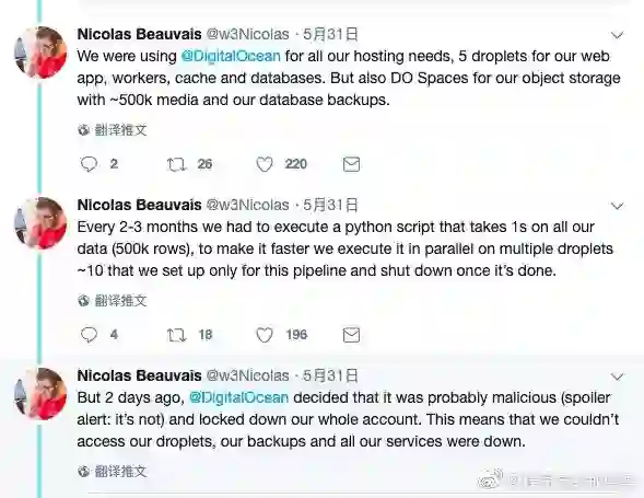 5 月 31 日,1 个法国程序员 Nicolas Beauvais 在推特上发了一系列帖子,控诉 1 个云服务商搞死他们公司了,从而引发了一场骚动。