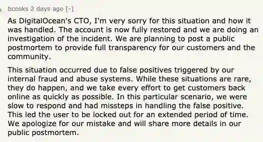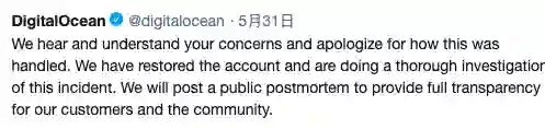 作为 DigitalOcean 的 CTO,我对这种情况和处理方式感到非常抱歉。目前该账户已完全恢复,我们正在对该事件进行调查。我们正计划发布一个公开报告,为我们的客户和社区提供完全的透明度。
