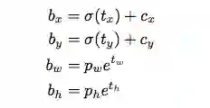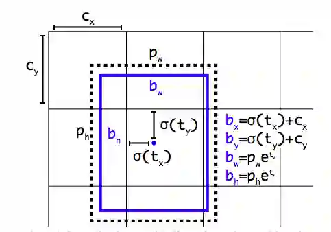 图2: 具有dimension priors和location prediction的边界框。我们预测了框的宽度和高度,作为cluster centroids的偏移量。我们使用sigmoid函数预测相对于滤波器应用位置的边界框的中心坐标。这个图是从YOLO9000论文[13]拿来的。