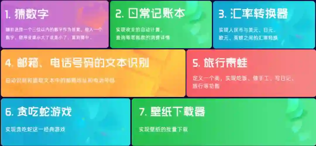 同时在Python编程课中,除了基本的Python语法,还有其他教程容易忽略的Map/Reduce、错误类型、正则表达式、内存管理等知识。同时还准备了记账本、文本识别、旅行青蛙、贪吃蛇、壁纸下载器等多个实战项目。