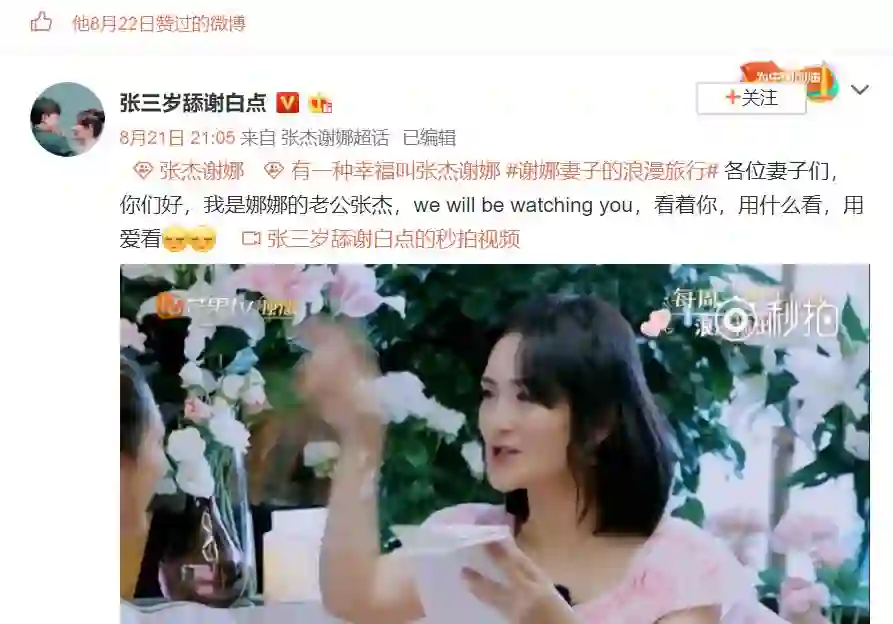 张杰负情绪的微博,最终停更在17年3月8号,最新的动态,是8月22号点赞了关于谢娜和自己的恩爱微博。