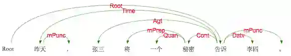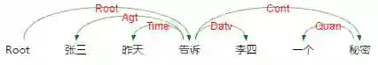 语义依存分析是通往语义深层理解的一条蹊径,它通过在句子结构中分析实词间的语义关系(这种关系是一种事实上或逻辑上的关系,且只有当词语进入到句子时才会存在)来回答句子中“谁在何时对谁做了什么”等问题。例如句子“张三昨天告诉李四一个秘密”,语义依存分析可以回答四个问题,即谁告诉了李四一个秘密,张三告诉谁一个秘密,张三什么时候告诉李四一个秘密,张三告诉李四什么。