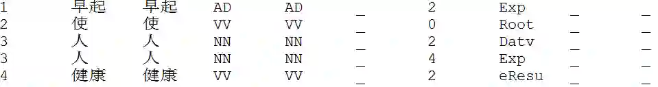 数据格式采用CoNLLX格式,如图4所示,其中第1列是词序号,第2列是词,第4列是词性,第7列是父节点序号(0表示父节点为虚拟根节点),第8列是当前词与父节点之间的语义关系(弧标签)。(在CoNLLX格式中第3列是词根,由于中文没有词根信息因此与第2列相同。第4、5列分别是粗粒度和细粒度词性,这里只有一种词性,因此这两列相同。)用多个具有相同词序号的行表示多父节点情况,每一行记录该词一个父节点的信息。例如图4中“人”有两个父节点,分别是序号为2的“使”和序号为4的“健康”,因此数据中序号为3的“人”占了2行。