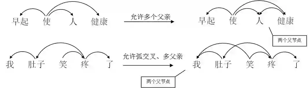 我中心于2016年与北京语言大学邵艳秋教授合作在SemEval-2012 Task 5中文语义依存树数据集的基础上针对其语义关系彼此易混淆、语义关系数量太大,有些关系在标注语料中出现次数很少;依存树结构,刻画语义不全面等问题,扩展了语义依存的表示形式,提出了中文语义依存图,在必要时突破树形结构。这样的突破使得对连动、兼语、概念转位等汉语中常见的现象的分析更全面深入,当然这也给依存分析器的构建带来了很大的难度,因为任何词都可能有多个父节点。图3直观地展示了语义依存树与依存图的区别。