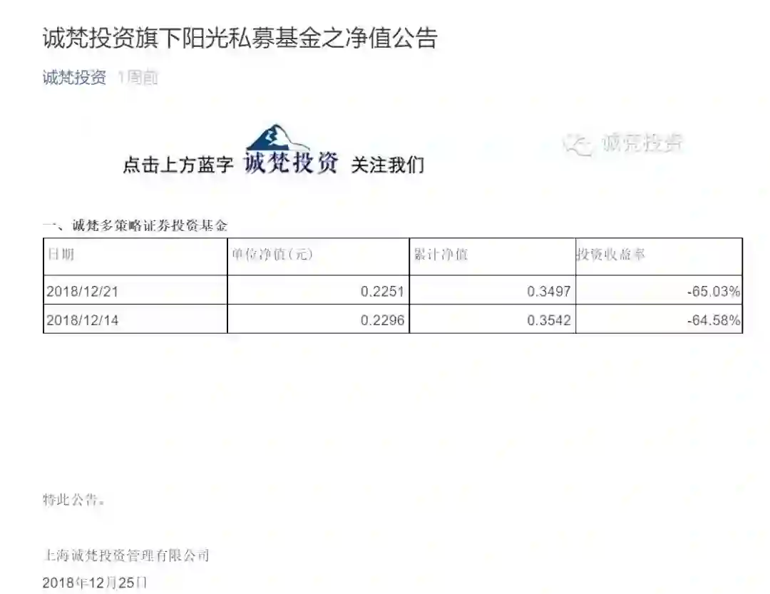 另外,据诚梵投资于2018年12月25日在其官方微博发布的“诚梵投资旗下阳光私募基金之净值公告”显示,诚梵投资旗下“诚梵多策略证券投资基金”截至2018年12月14日的投资收益率为-64.58%;截至2018年12月21日的投资收益率为-65.03%。据基金业协会显示,该支基金于2015年4月27日成立,目前正在运作中。
