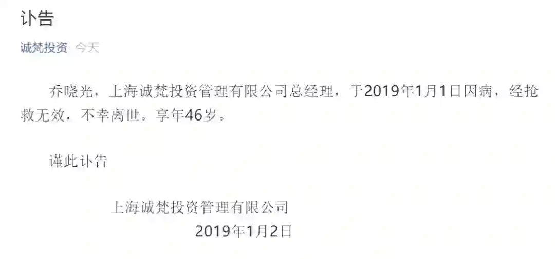 2019年1月2日,上海诚梵投资管理有限公司(以下简称“诚梵投资”)在其官方微信号“诚梵投资”发布一讣告称,乔晓光,上海诚梵投资管理有限公司总经理,于2019年1月1日因病,经抢救无效,不幸离世。享年46岁。