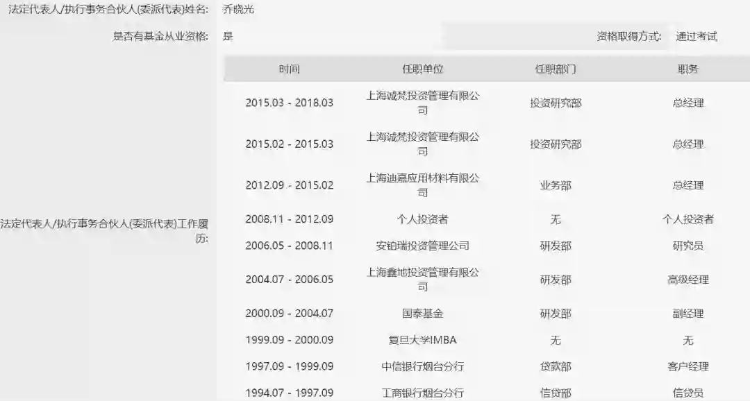 根据基金业协会官网披露的私募基金管理人公示信息显示,乔晓光曾在工商银行、中信银行、国泰基金、鑫地投资、安铂瑞投资、上海迪嘉等就职过,2015年2月就任诚梵投资总经理职位。