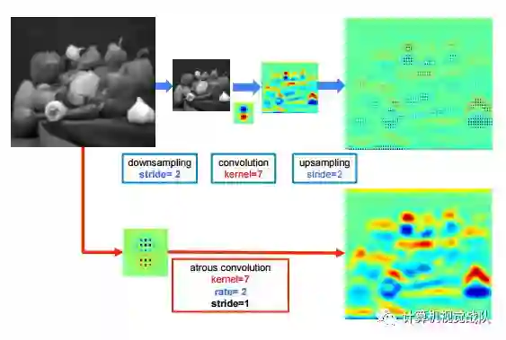 特征分辨率下降。主要由于重复池化和下采样造成,作者移除了最后几个最大池化层下采样操作,并对滤波器进行上采样,在非零的滤波器值之间加入空洞,称为atrous卷积。 atrous卷积示意图为: