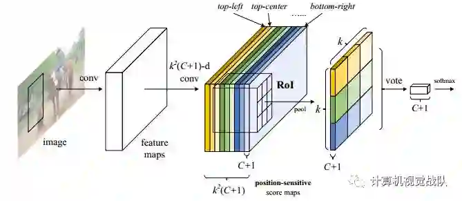 上图示基于区域的全卷积框架图,而且这也是第一次用于目标检测的全卷积网络,最后的效果得到了很好的效果