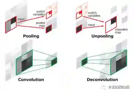 众所诸知,池化会缩小图片的尺寸,比如VGG16 五次池化后图片被缩小了32倍。为了得到和原图等大的分割图,我们需要上采样/反卷积。反卷积和卷积类似,都是相乘相加的运算。只不过后者是多对一,前者是一对多。而反卷积的前向和后向传播,只用颠倒卷积的前后向传播即可。所以无论优化还是后向传播算法都是没有问题。上池化的实现主要在于池化时记住输出值的位置,在上池化时再将这个值填回原来的位置,其他位置填0。图解如下: